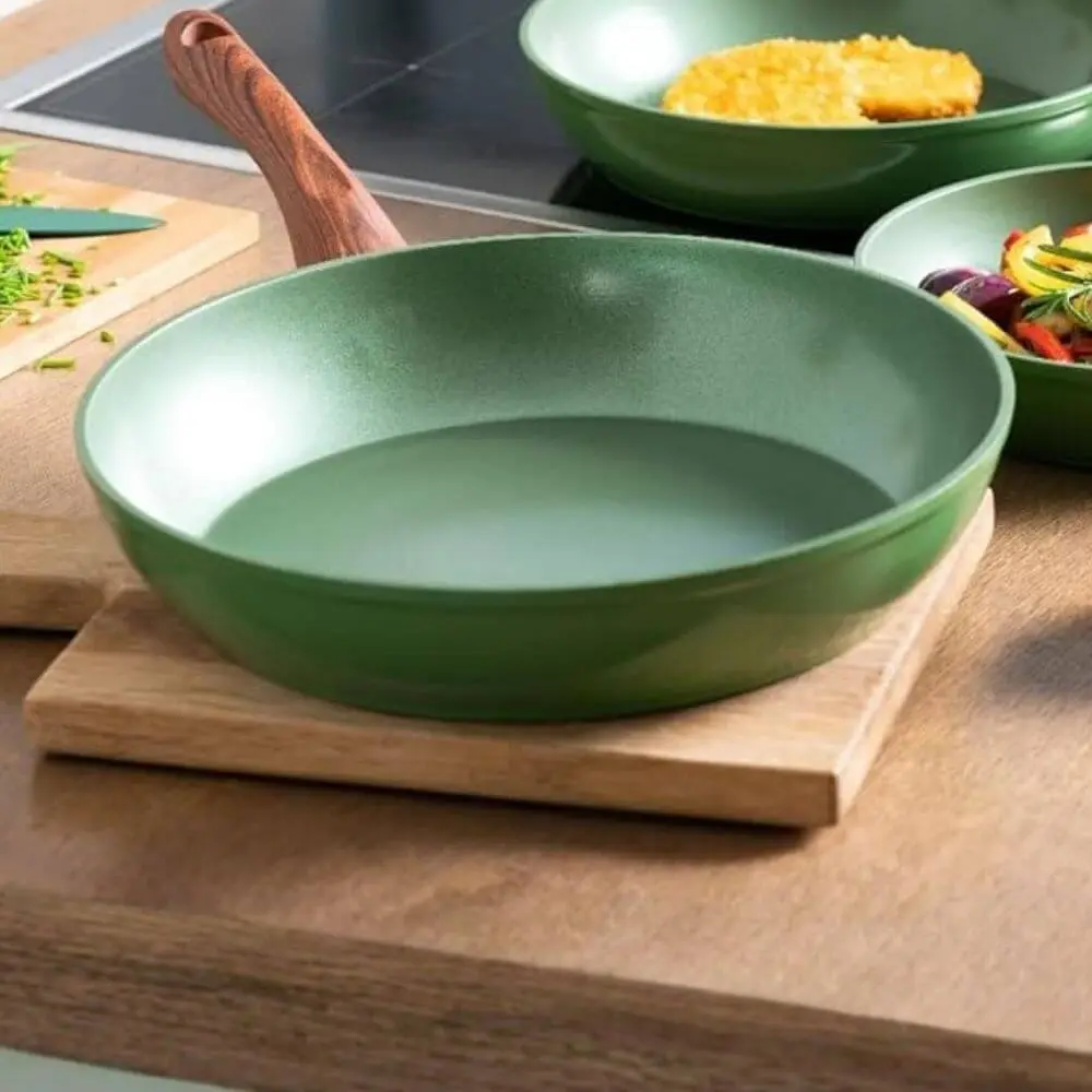 Tava gövdeleri alüminyumdan imal edilmiş olup, hızlı ve homojen ısı iletimi sağlar. Bu sayede etli-etesiz fark etmeksizin, sebzeyi, vegan burgeri veya klasik omleti yüksek performansla pişirebilirsiniz. İç yüzeyde yer alan bitki bazlı seramik yapışmaz kaplama, geleneksel yapışmaz kaplamalara göre daha sağlıklı bir alternatif sunar: üst katmanda avokado yağı ve su karışımı ile oluşturulmuş mikrofilm sayesinde yemekler tavanın yüzeyine kolay yapışmaz, temizliği rahattır.