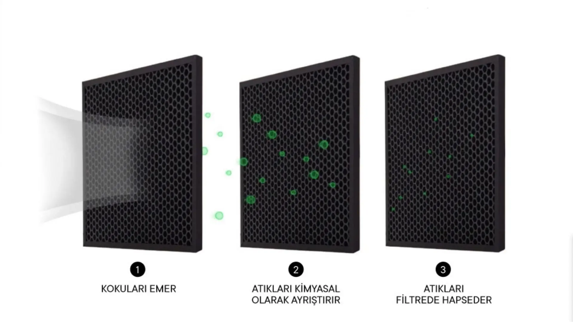 Aktif Karbon Filtresindeki patentli ARC formülü, kokuları kimyasal olarak ayrıştırarak koku giderme performansını %60 artırır.