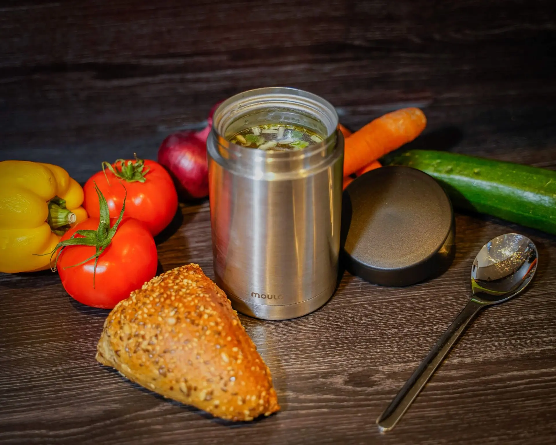 Moulo Metal Yemek Termosu, gün içinde yemeğinizi taze, sıcak ya da serin halde saklayarak sağlıklı beslenme alışkanlıklarınızı destekleyen şık ve fonksiyonel bir üründür. Çift cidarlı vakum izolasyonu sayesinde çevredeki sıcaklık ne olursa olsun içindeki yiyeceğinizin sıcaklığı ya da soğukluğu uzun süre korunur — dış sıcaklık etkisini büyük ölçüde kaybederek, yemeklerinizi güvenle taşımanızı sağlar.
