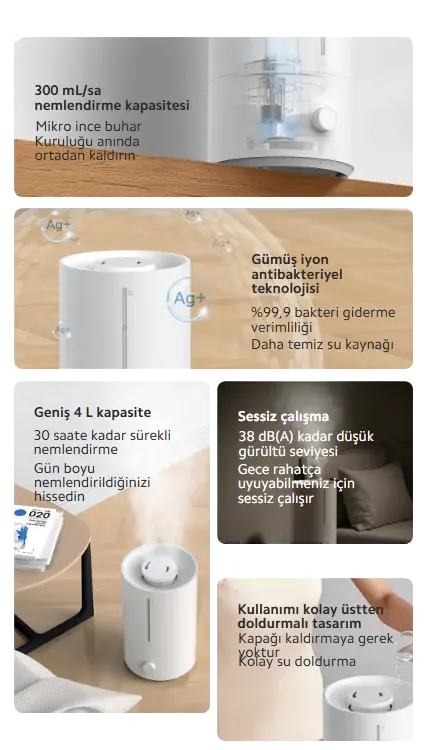 • 4 litrelik geniş su haznesi ile uzun süre kesintisiz nemlendirme